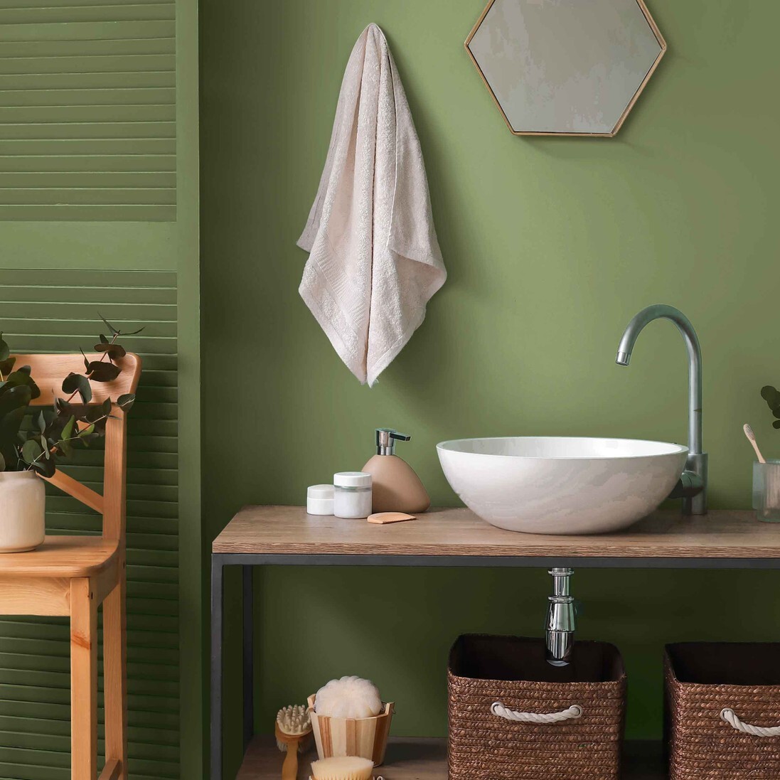 Invitez la nature à l'intérieur. Intégrer des éléments naturels dans la salle de bains est une tendance en plein essor, créant une atmosphère de calme et de revitalisation avec des teintes émeraude riches, des verts profonds, des nuances de menthe fraîche ou de sauge terreuse. Essayez des couleurs comme "Broussaille" ou "Sérénité" pour créer votre propre oasis de tranquillité.